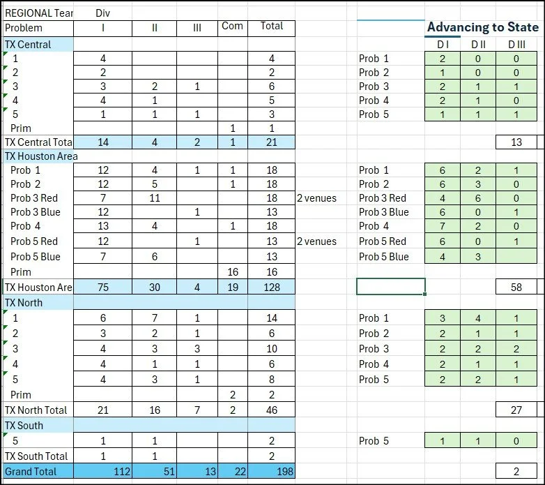 State promotion rules: This is NOT proportional. Irrespective of how many teams participate, the top 2 qualifying teams from each problem venue and each division advance to the in-person World Finals tournament. However, we also advance any ties and any team that receives a Ranatra Fusca creativity award (either team or individual award).